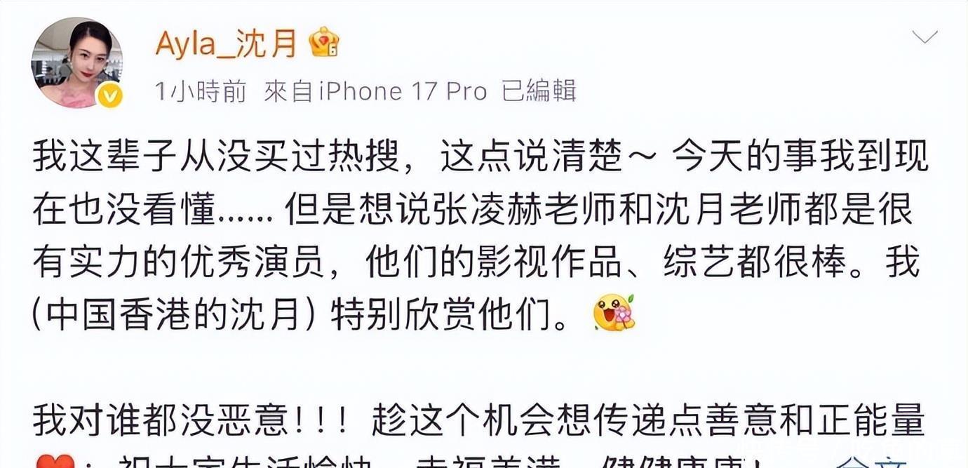 风波中心的Ayla_沈月率先作出反应。当日下午,她在个人微博发布一个孤立的“?”符号后秒删,这一充满困惑的举动被网友解读为对身份混淆的无奈。随后,她以一份正式声明廓清迷雾:“我这辈子从没买过热搜,这点必须要说清楚,”她在文中坦言对事件的始末“没看懂”,但明确表达了对张凌赫与内地演员沈月两位同行专业能力的肯定与欣赏,并强调“对谁都没恶意,趁这个机会传递正能量”。这份回应,被多数观察者视为得体——她既是这场风波的被动卷入者,也试图在其中扮演误解终结者的角色。